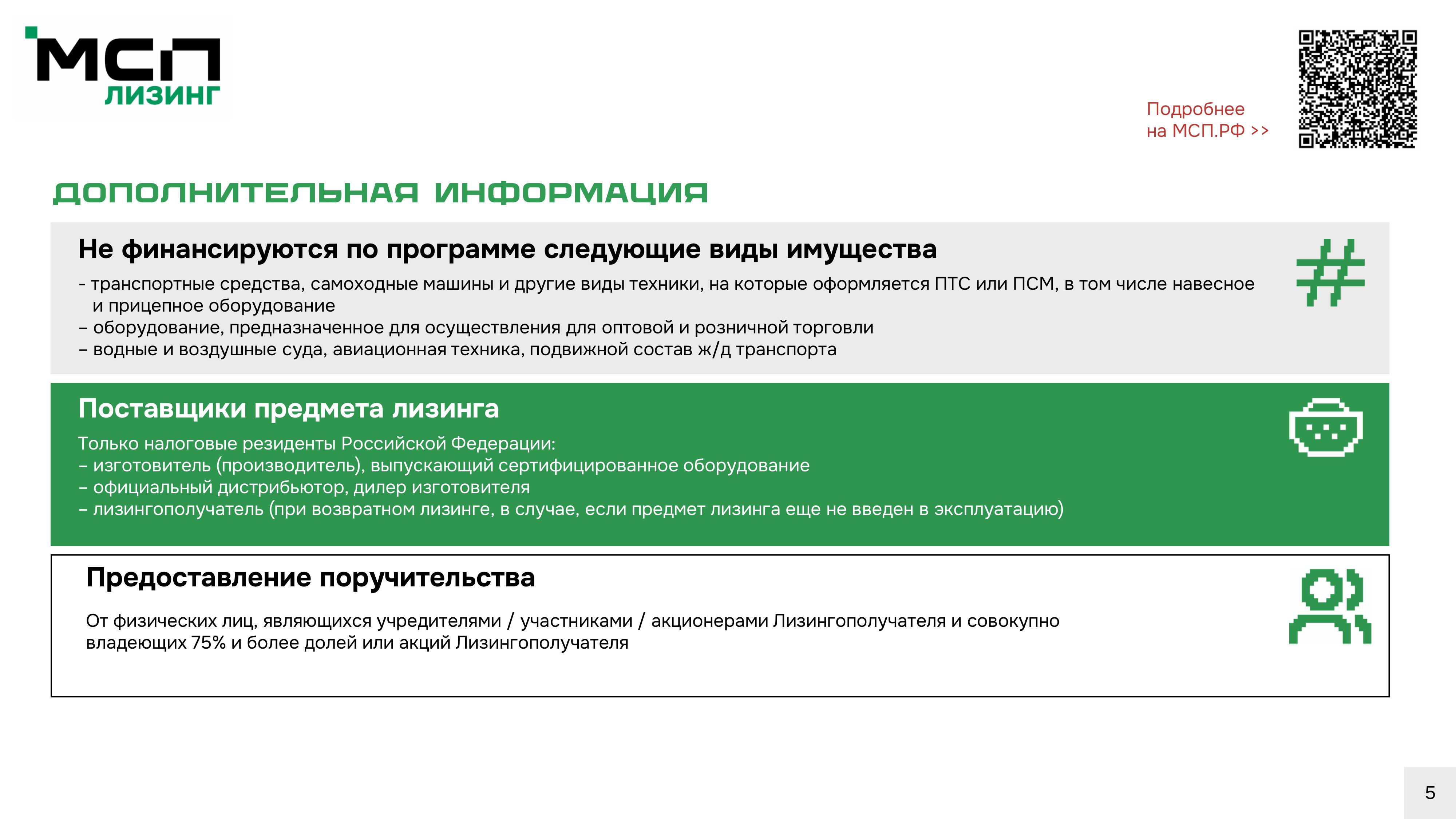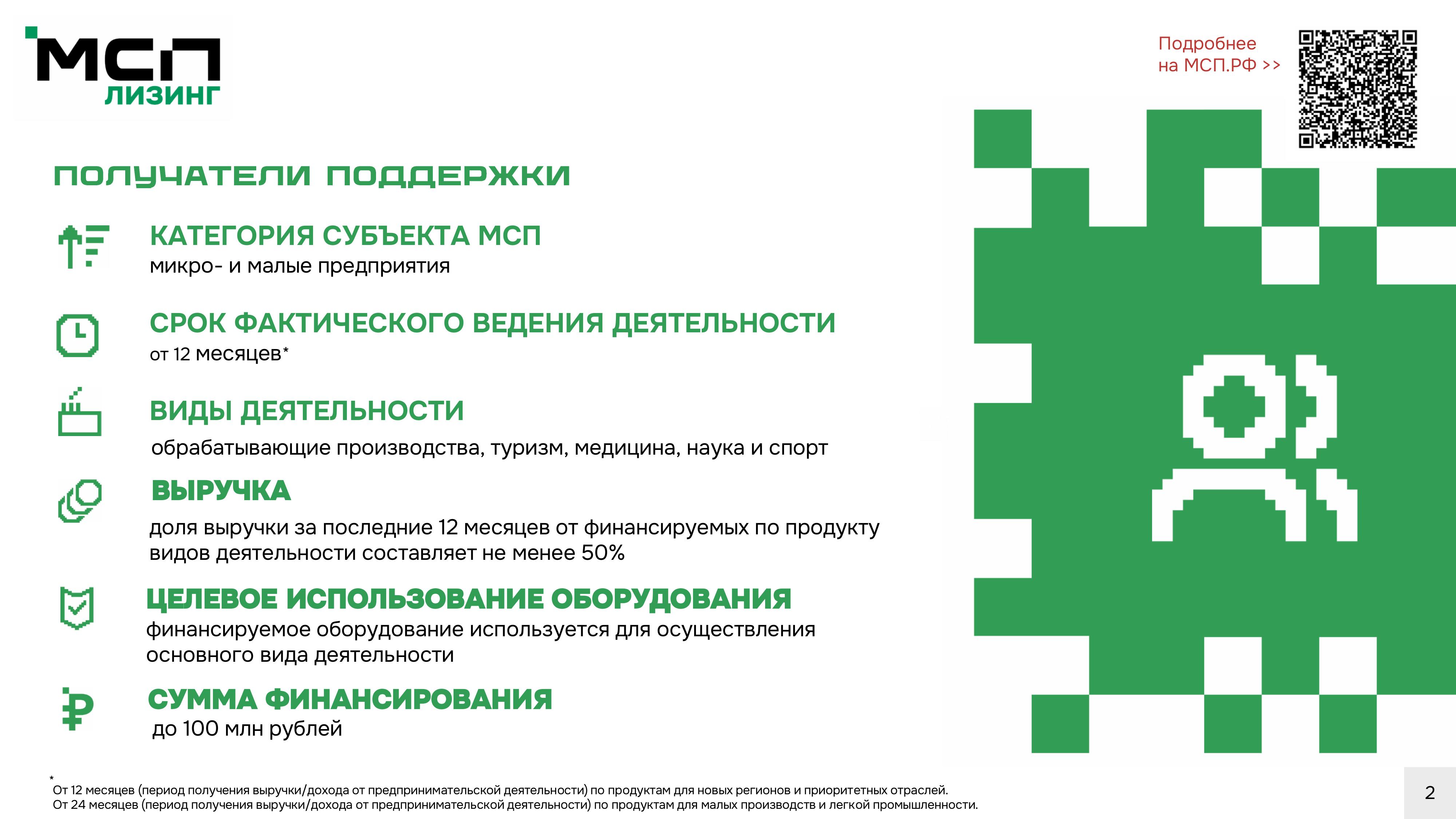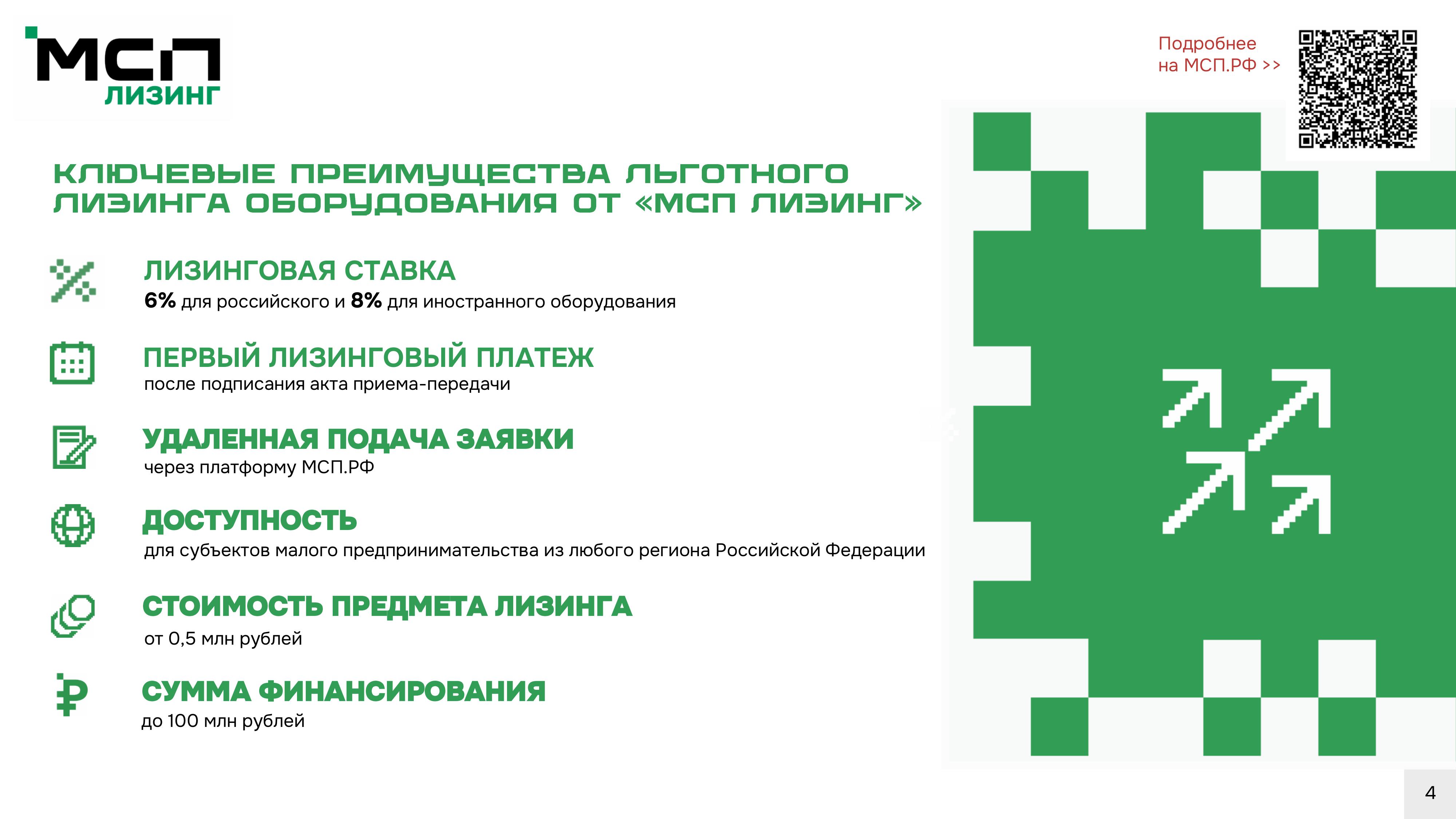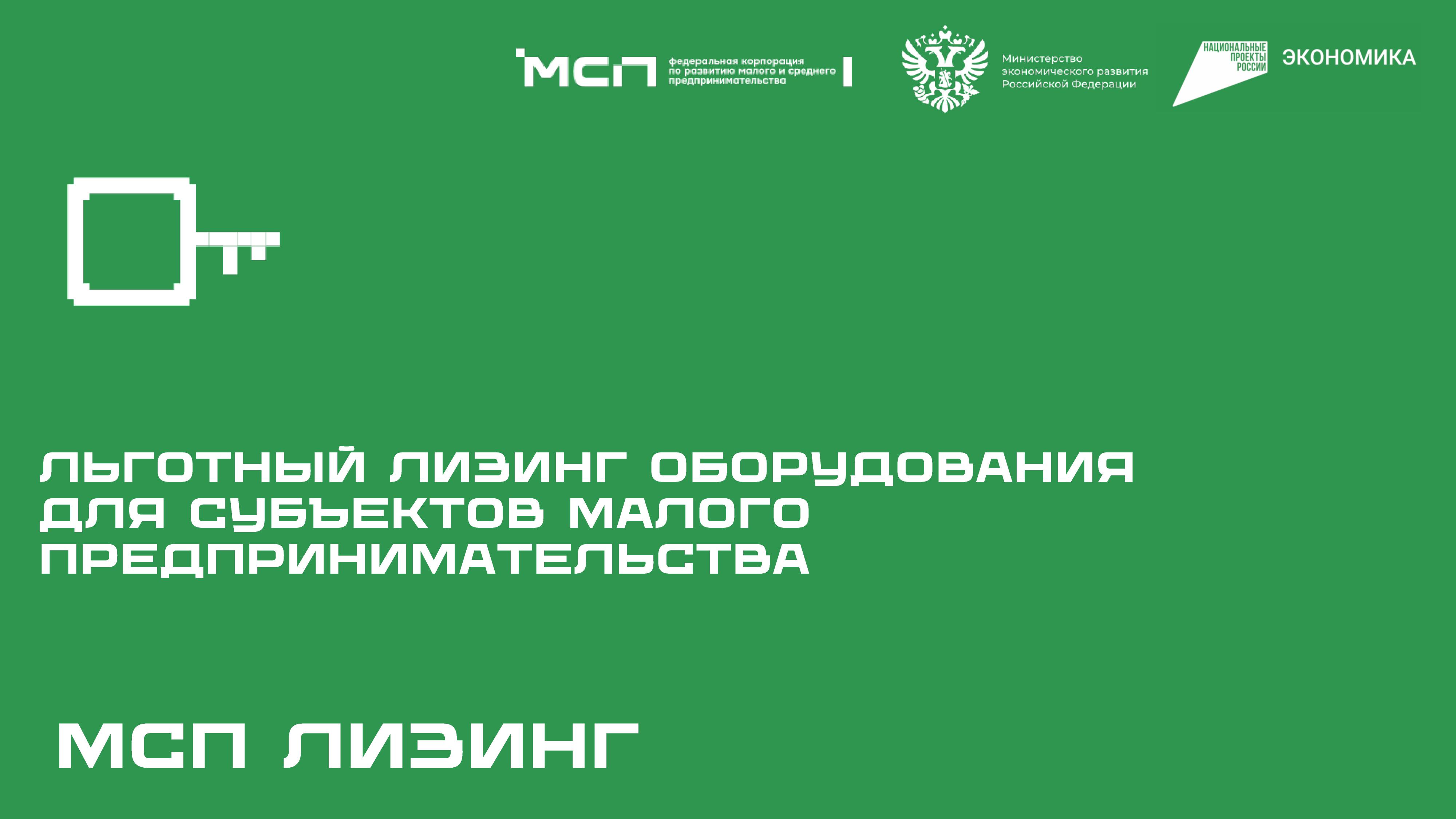 AO «МСП Лизинг», 100% дочернее общество AO «Корпорация «МСП», реализует программу льготного лизинга нового оборудования для субъектов малого предпринимательства. Льготная программа лизинга оборудования открывает доступ микро- и малому бизнесу к модернизации и увеличению производственных мощностей за счет приобретения нового современного оборудования по ставкам 6% для российского оборудования и 8% — для иностранного.