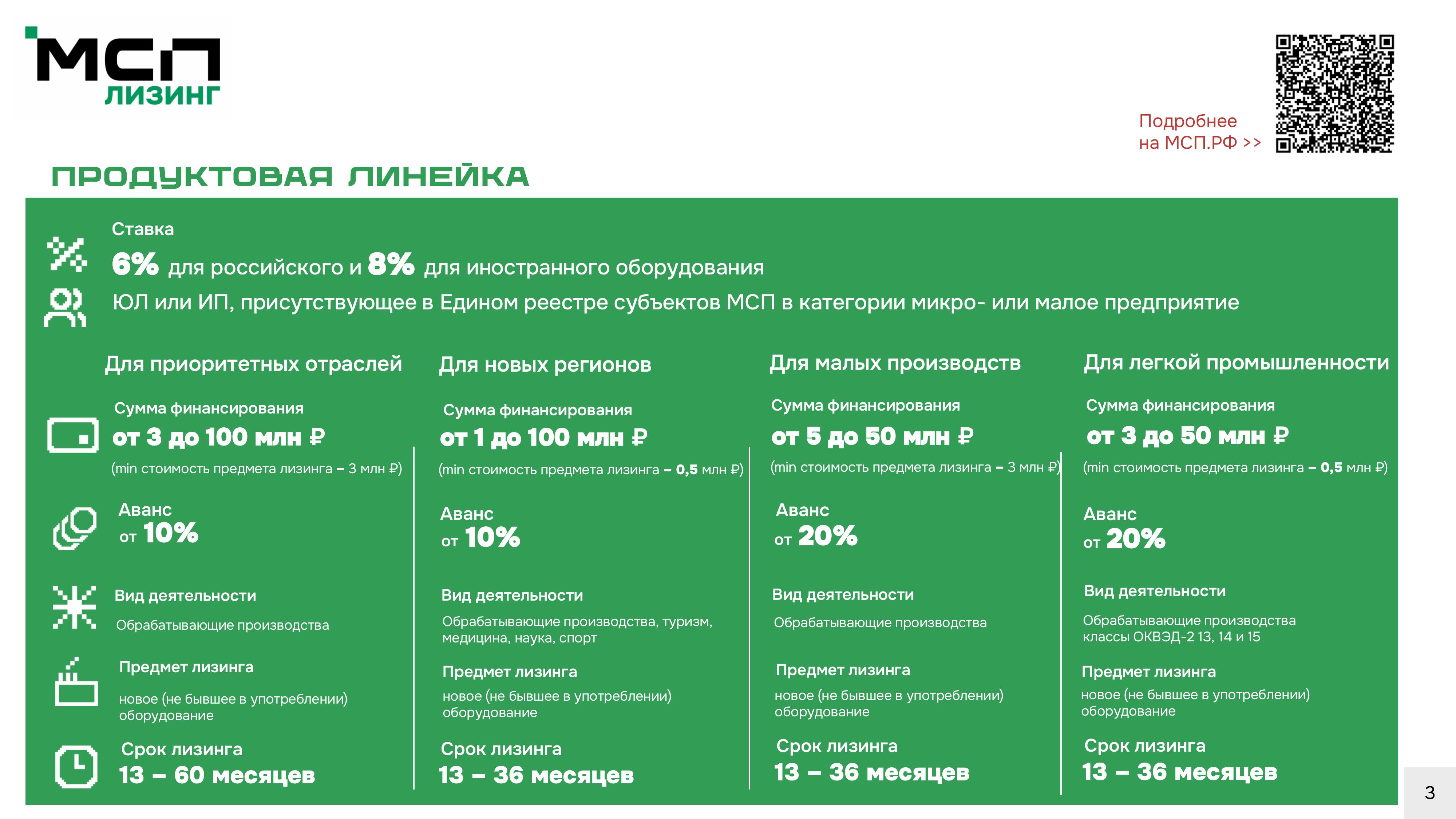 AO «МСП Лизинг», 100% дочернее общество AO «Корпорация «МСП», реализует программу льготного лизинга нового оборудования для субъектов малого предпринимательства. Льготная программа лизинга оборудования открывает доступ микро- и малому бизнесу к модернизации и увеличению производственных мощностей за счет приобретения нового современного оборудования по ставкам 6% для российского оборудования и 8% — для иностранного.